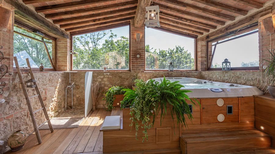 Two of these, both carefully restored, are the perfect place to relax while admiring the suggestive surrounding landscape: in one, a welcoming reading corner has been created, while in the other a relaxation room with a hydromassage pool.
