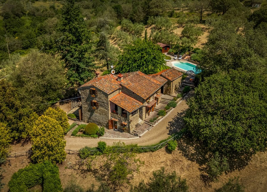 Casale Ronco, a splendid stone farmhouse surrounded by its private gardens at the foothills of the Pratomagno mountains, has been all this for Anne and Richard. With its open views over olive groves and the Tuscan countryside, the property seems almost protected by the mountains which, like silent guardians, preserve its tradition and charm.